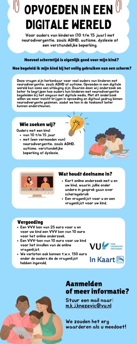 Digitale media speelt in de opvoeding van veel ouders een grote rol, juist bij kinderen met neurodivergentie. Ouders merken vaak dat schermen en digitale media aan de ene kant kansen bieden, bijvoorbeeld voor ontspanning of sociale contacten. Tegelijkertijd brengt het ook uitdagingen en risico’s met zich mee, zoals het omgaan met schermtijd of het veilig navigeren van online omgevingen. Met ons onderzoek willen wij beter begrijpen hoe ouders deze balans proberen te vinden, zodat we gezinnen in de toekomst beter kunnen ondersteunen.